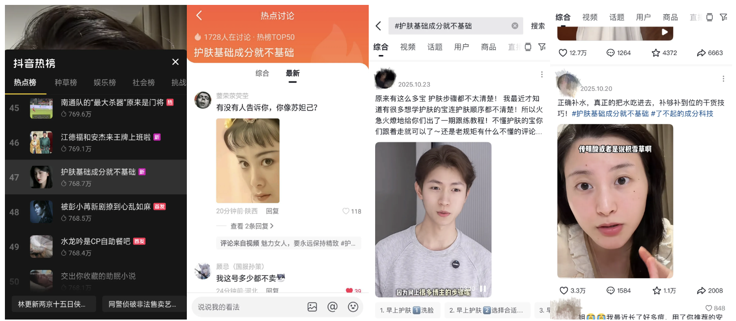 其中#护肤基础成分就不基础 直接冲上种草榜TOP4、抖音热点榜TOP47,网友自发分享“补水补到位的干货技巧”,“护肤顺序教程”,传播从“官方说”变成了“大家聊”,热度自然居高不下。